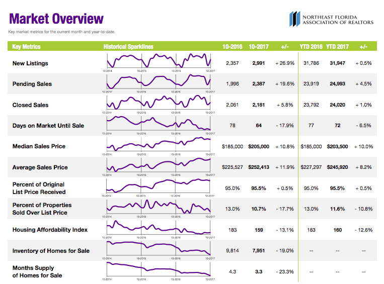 Despite a sluggish September, thanks to Hurricane Irma, the real estate market was on the upswing again in October. There was a spike in new listings after the dip in September. It is still a seller’s market with only 3.3 months of inventory available and 10.7% of homes sold above list price.